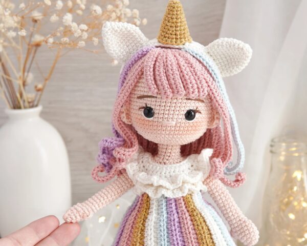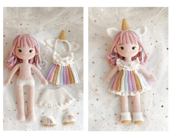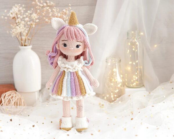 Meet Sofia, a sweet doll with a big love for unicorns and a flair for sparkle! This digital crochet pattern includes detailed instructions to create Sofia along with her removable outfit: a colorful dress, sparkling boots, and a whimsical unicorn headband.